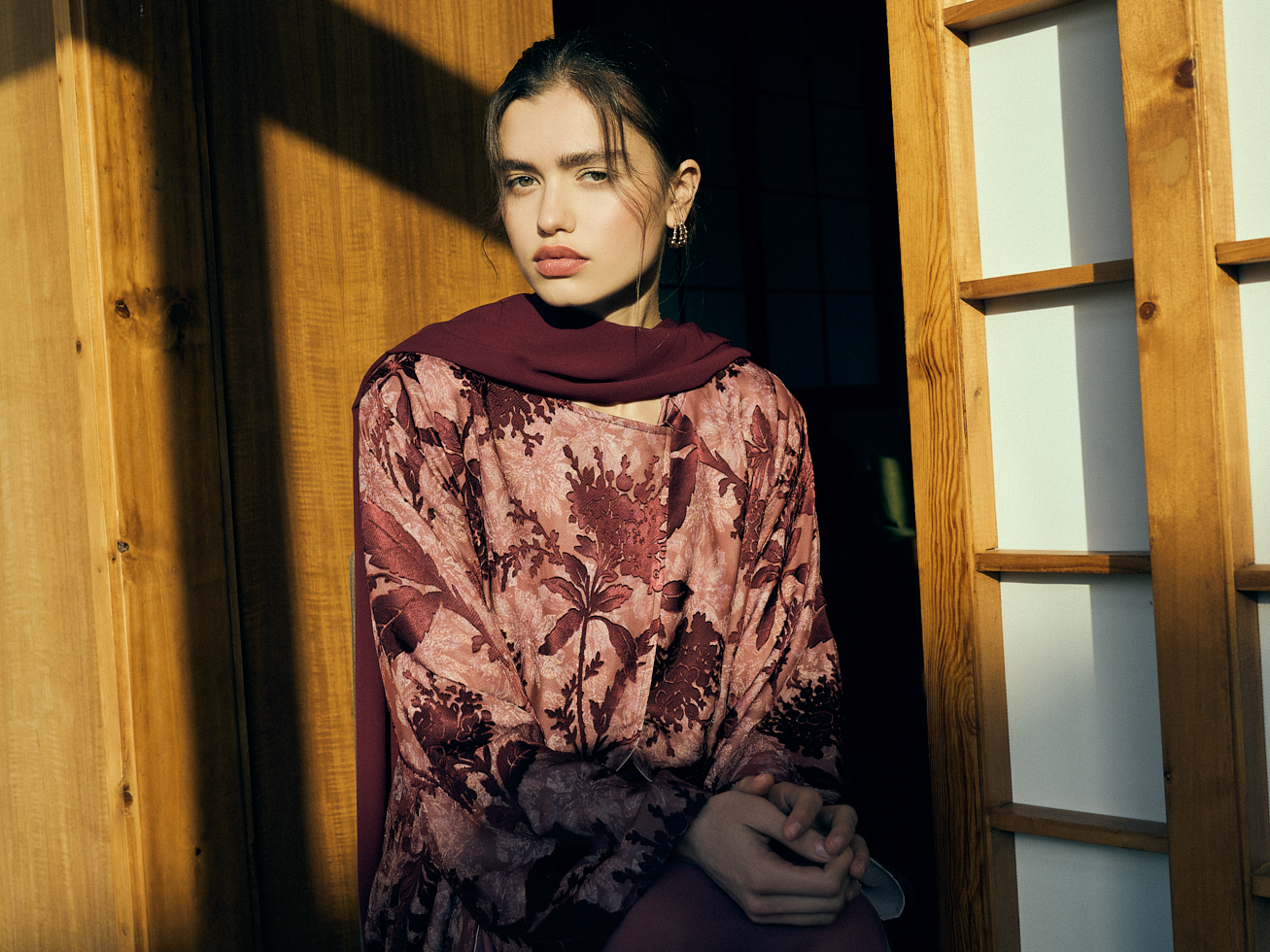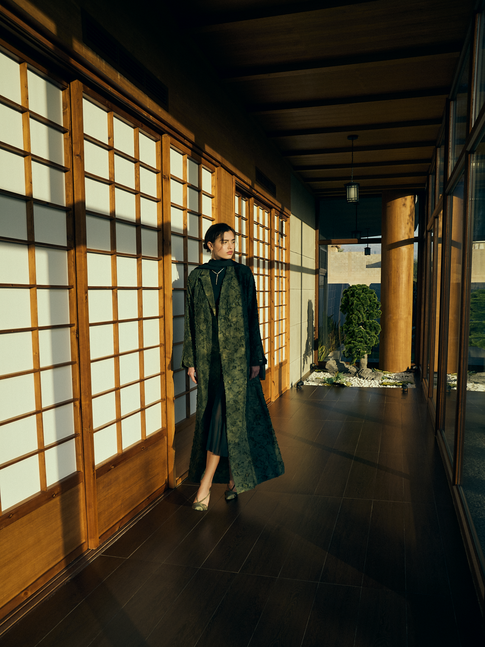 It features tailored outerwear and evening layers crafted from jacquards, velvets, textured tweeds, and soft florals. The color story moves through moss green, muted olive gold, dusty rose, deep wine, midnight blue, and shadowed neutrals.