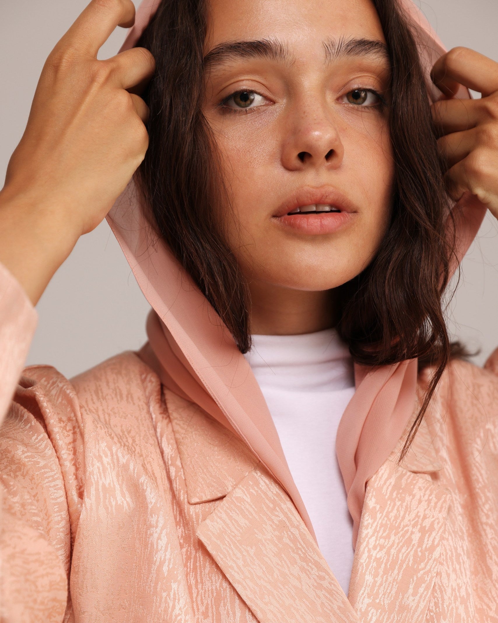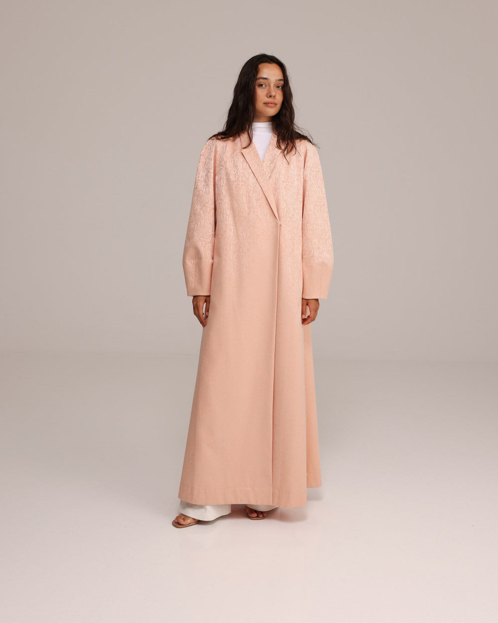 A soft peach abaya with structured tailoring that subtly catch the light. The sculpted sleeves feature a gently rounded shape with a clean cuff, adding form and elegance to the fluid silhouette.