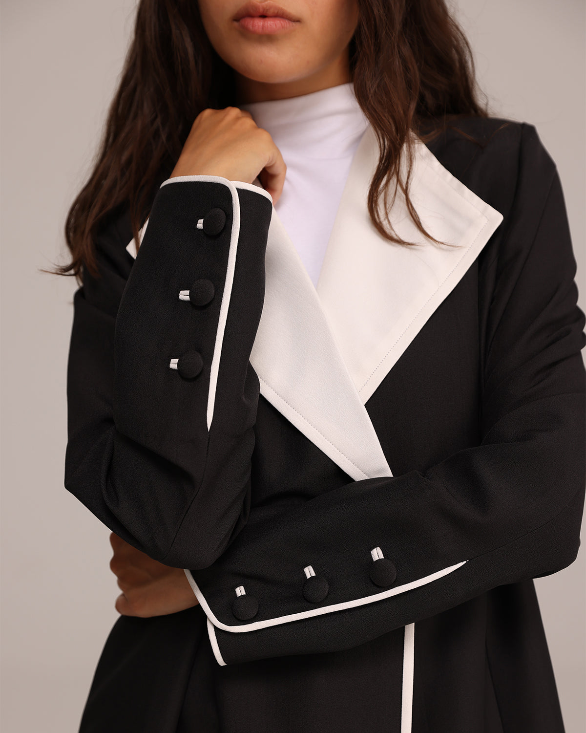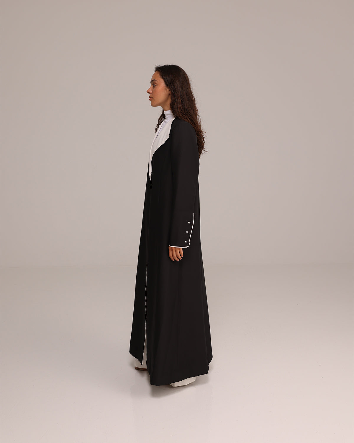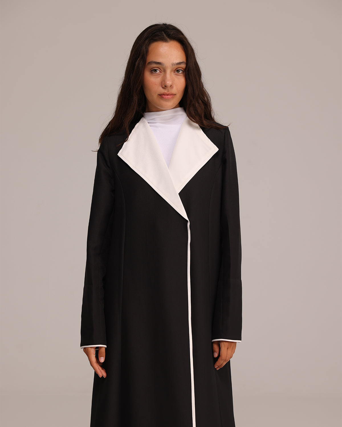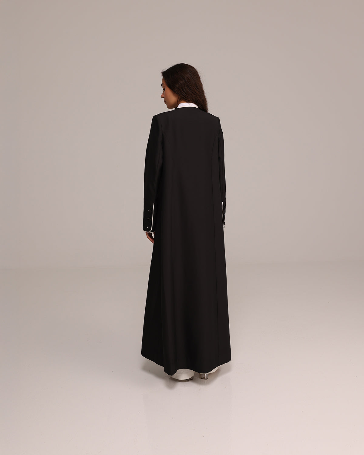 A statement abaya in black with a bold white lapel collar and detailed sleeve accents. Origin stands out with its crisp contrast, oversized pointed collar, and custom button detailing at the cuff. White piping along the front edge frames the silhouette with sharp precision.