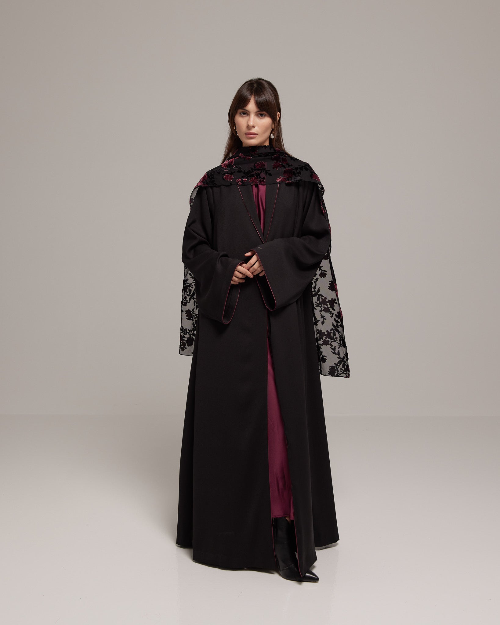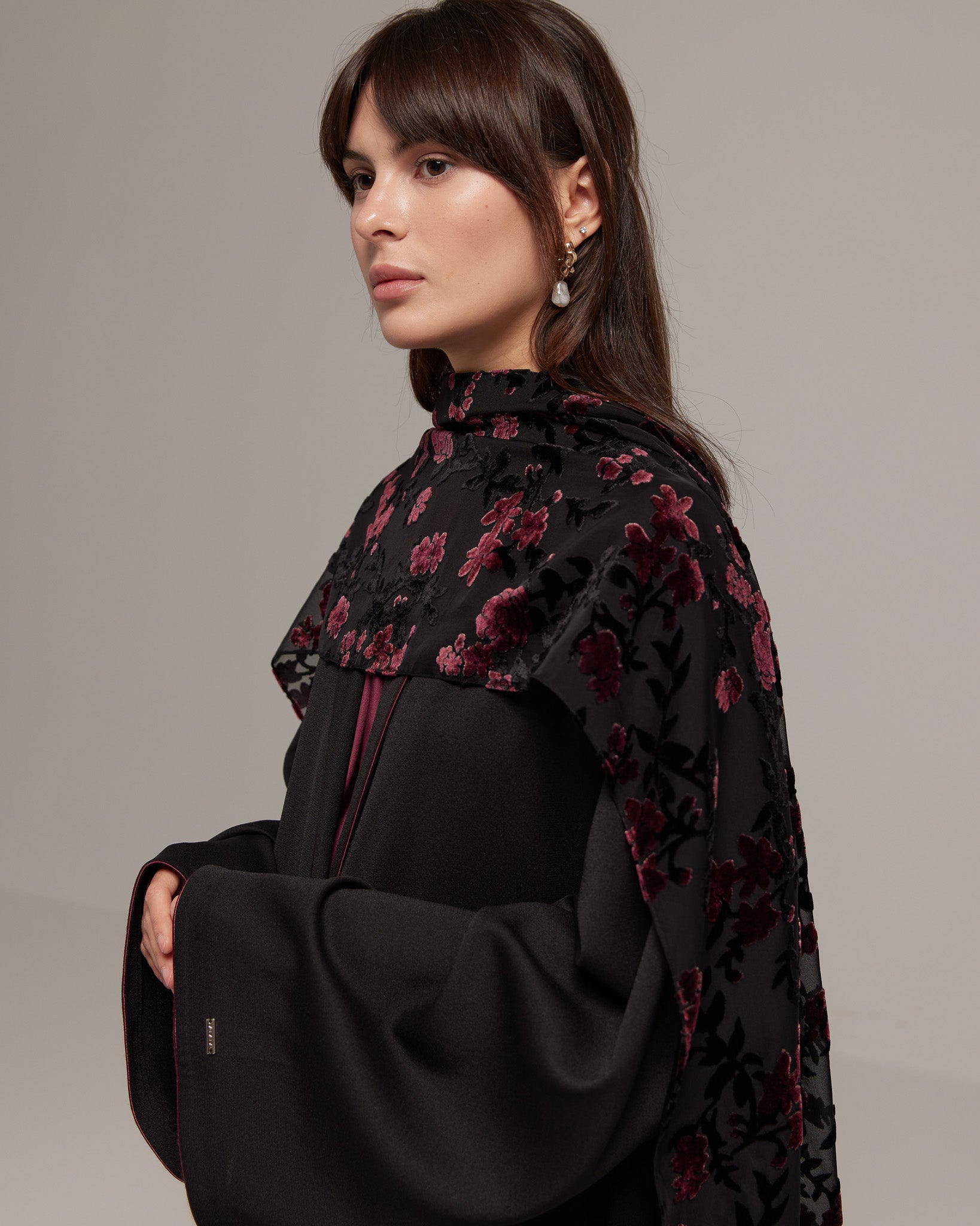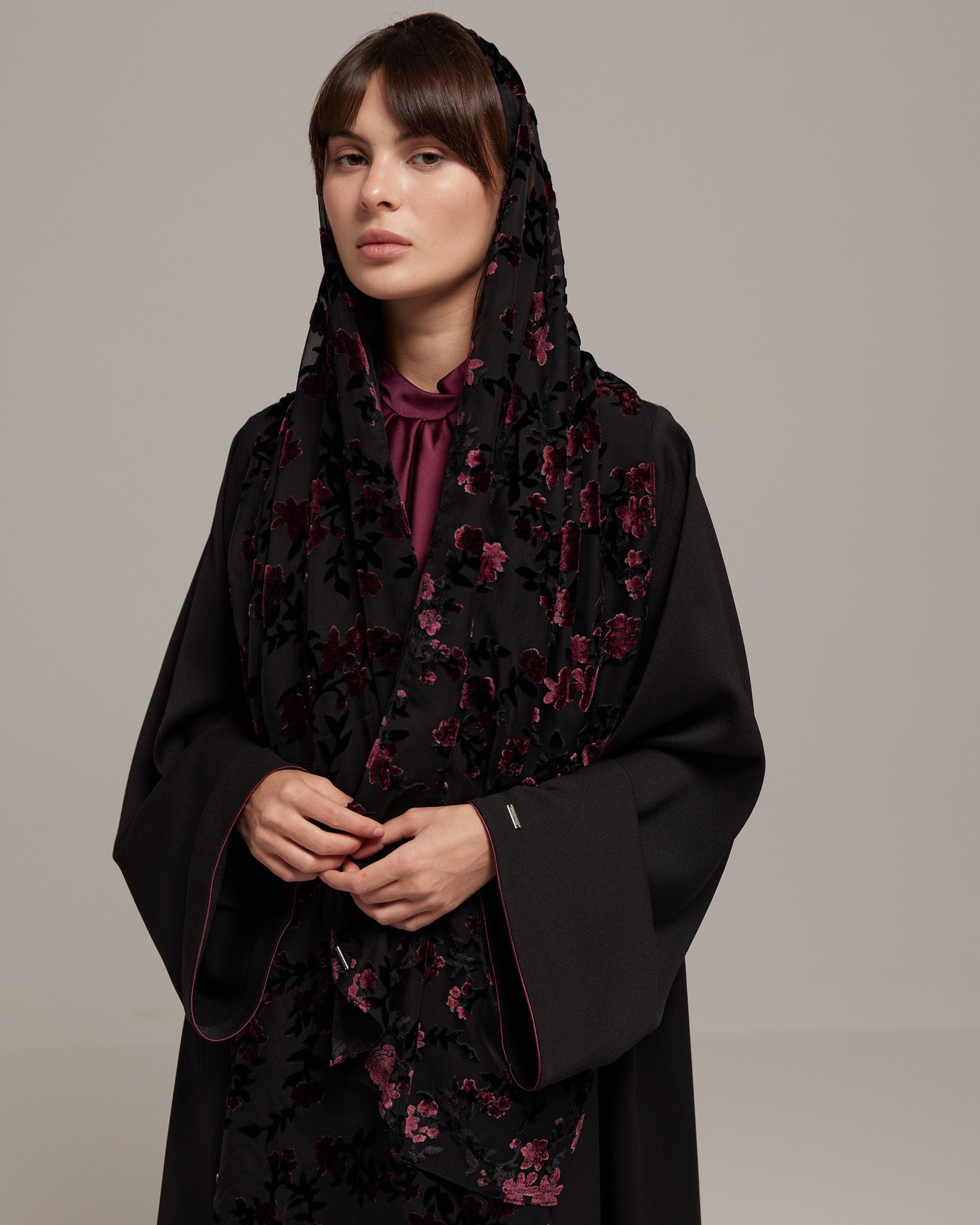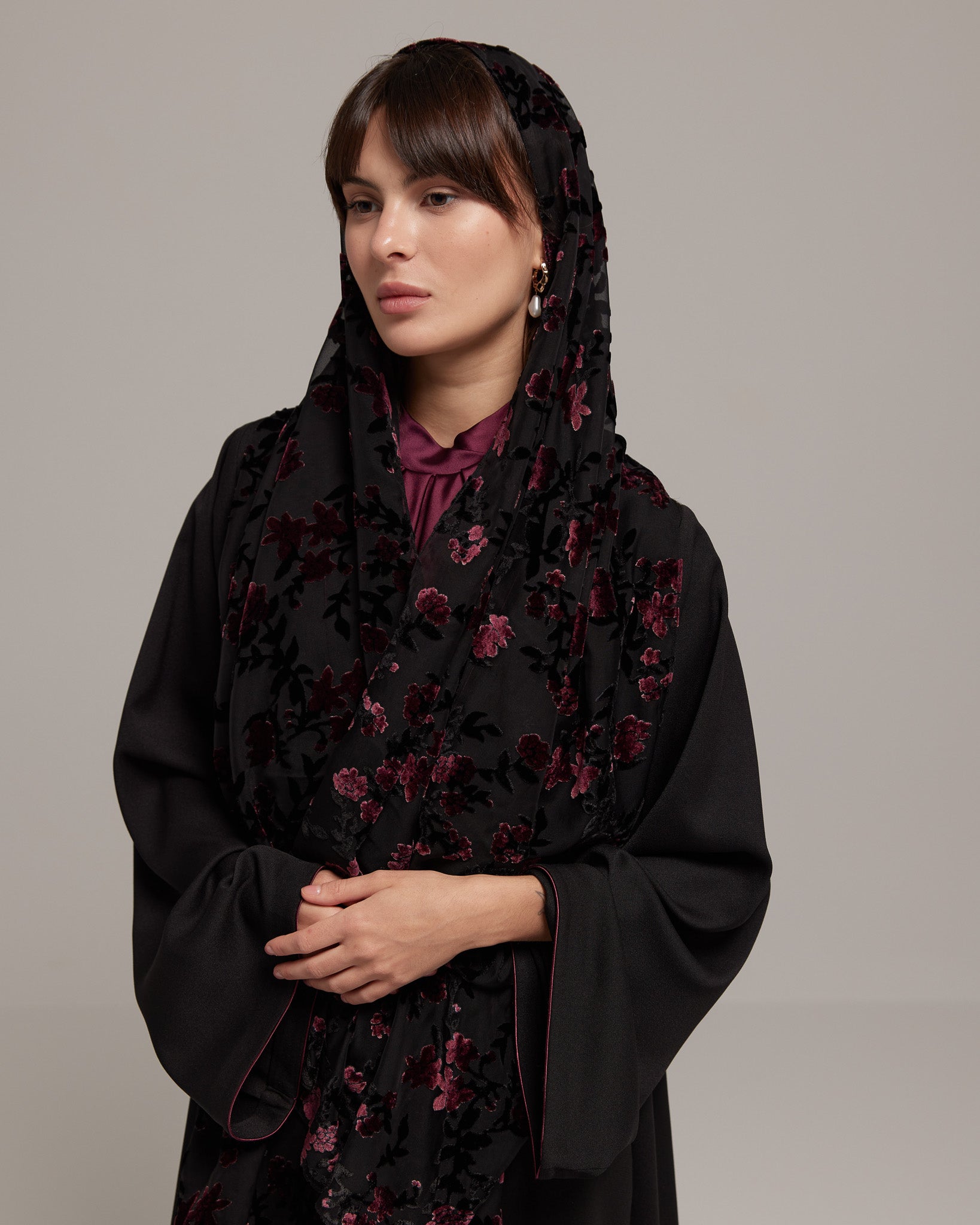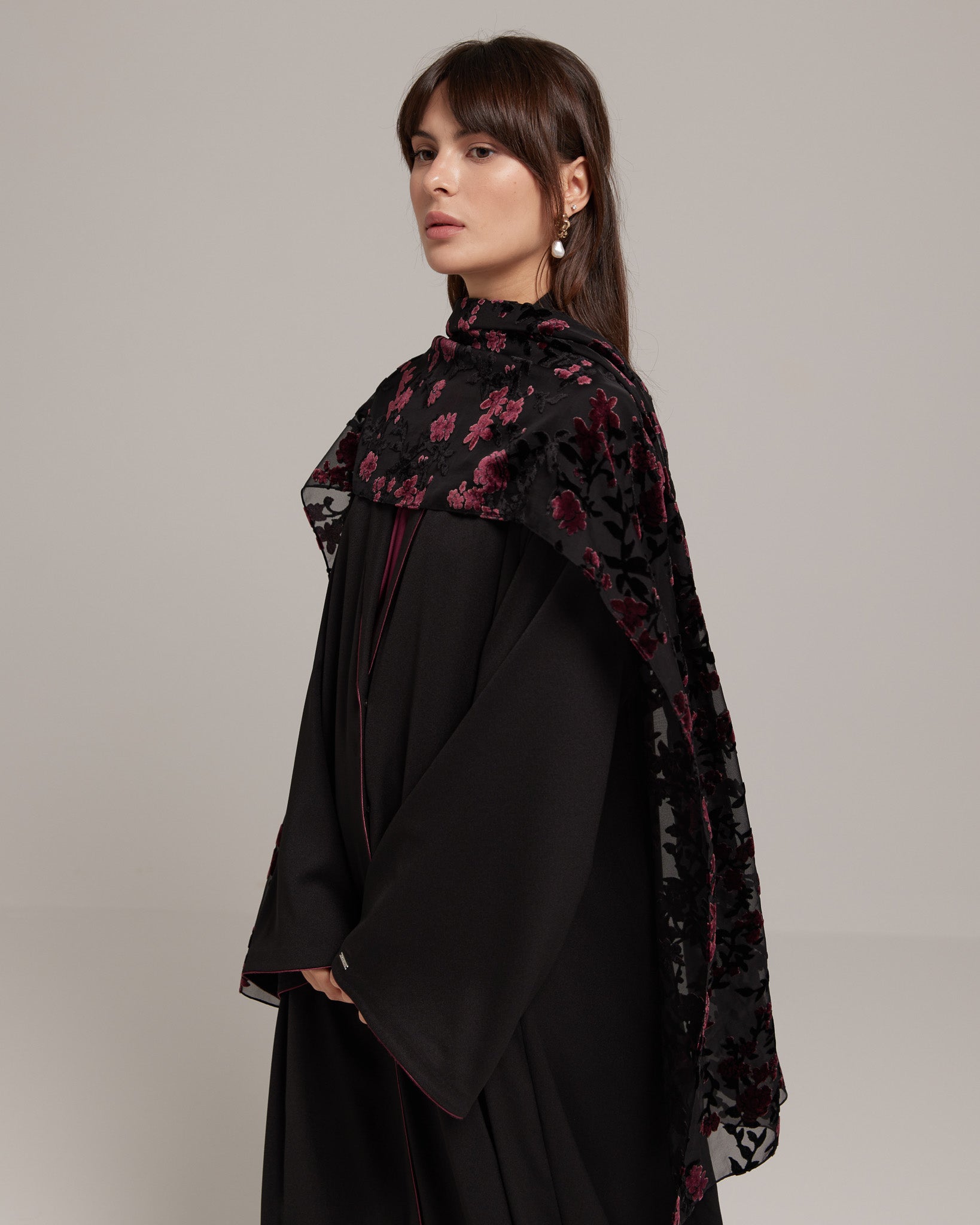 A black draped abaya accented with  maroon piping, paired with a maroon velvet floral sheila. Designed with understated elegance, it offers  presence through restraint.