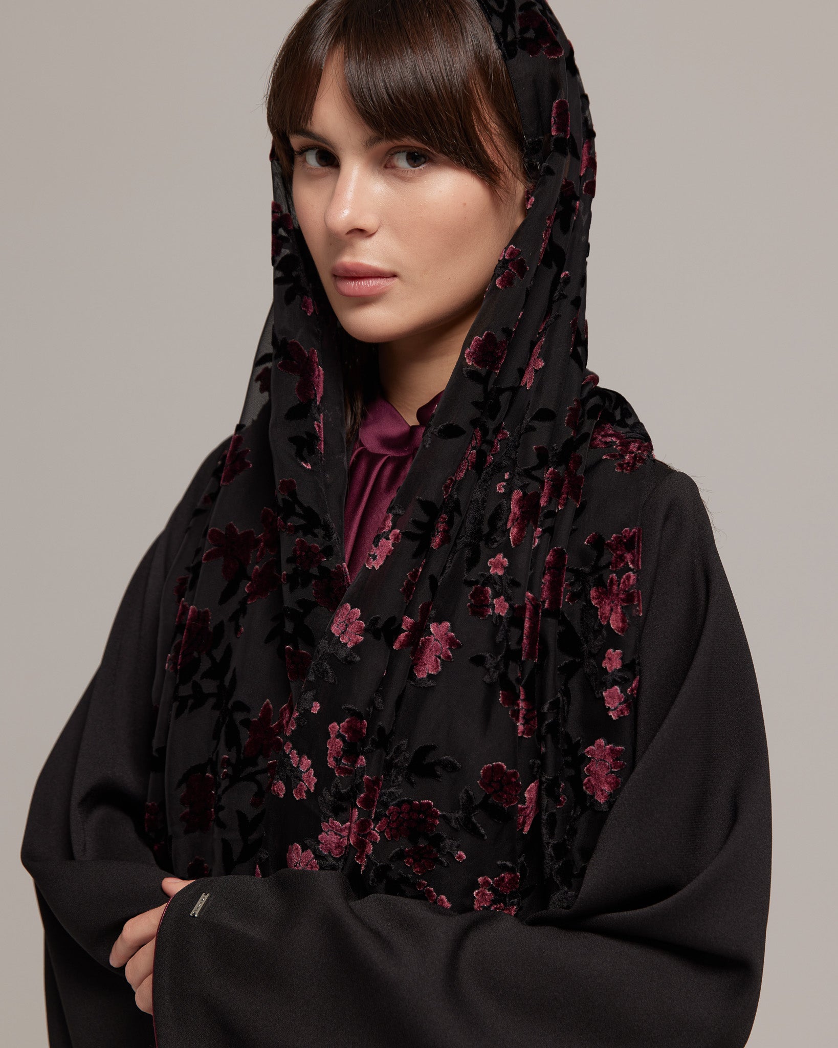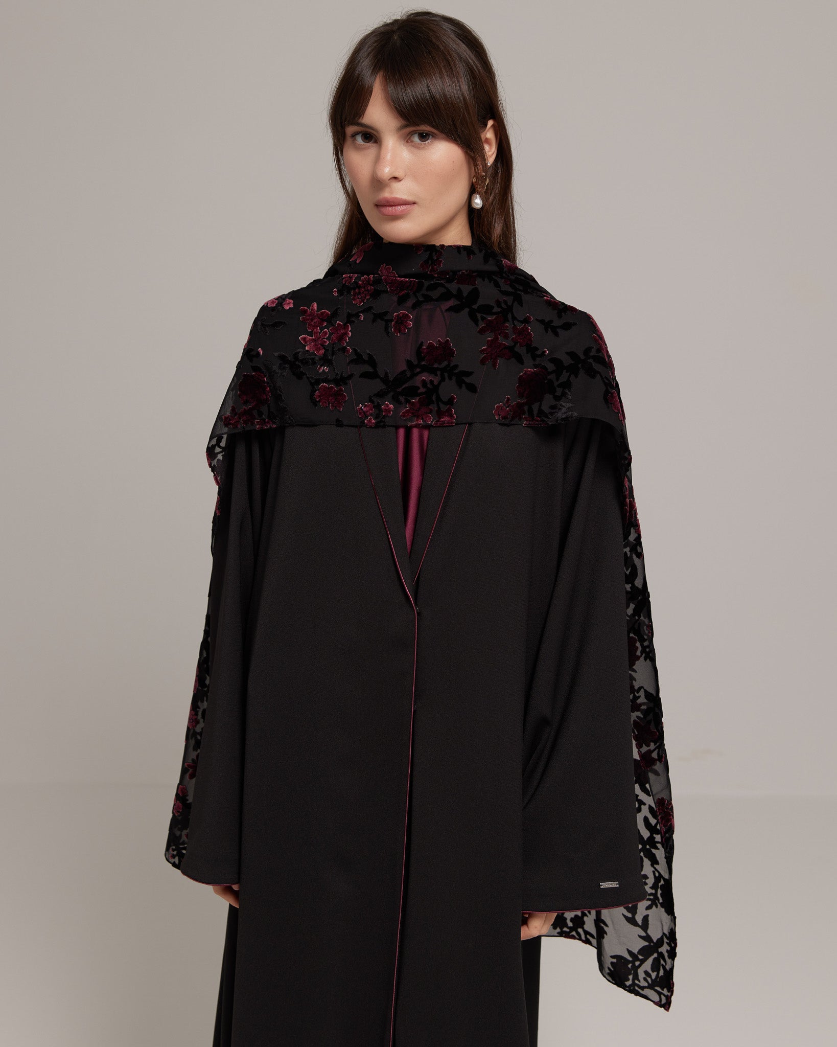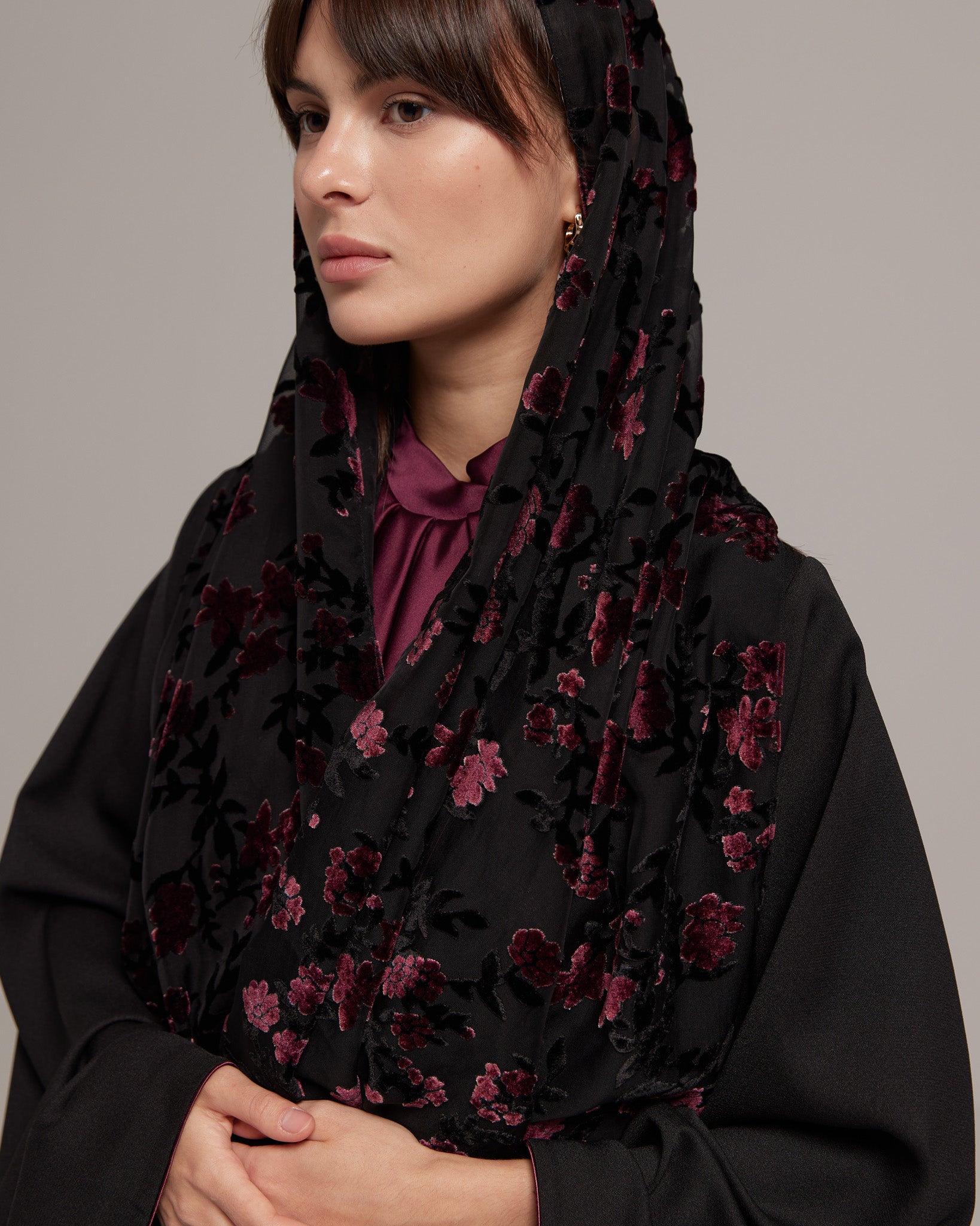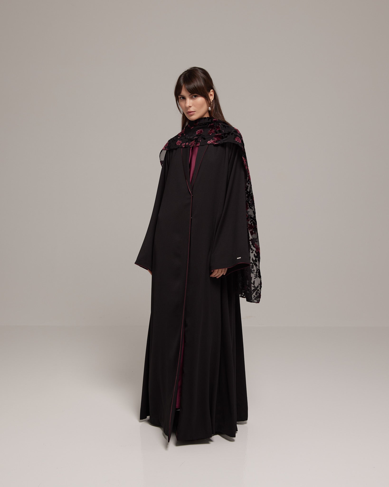 A black draped abaya accented with  maroon piping, paired with a maroon velvet floral sheila. Designed with understated elegance, it offers  presence through restraint.