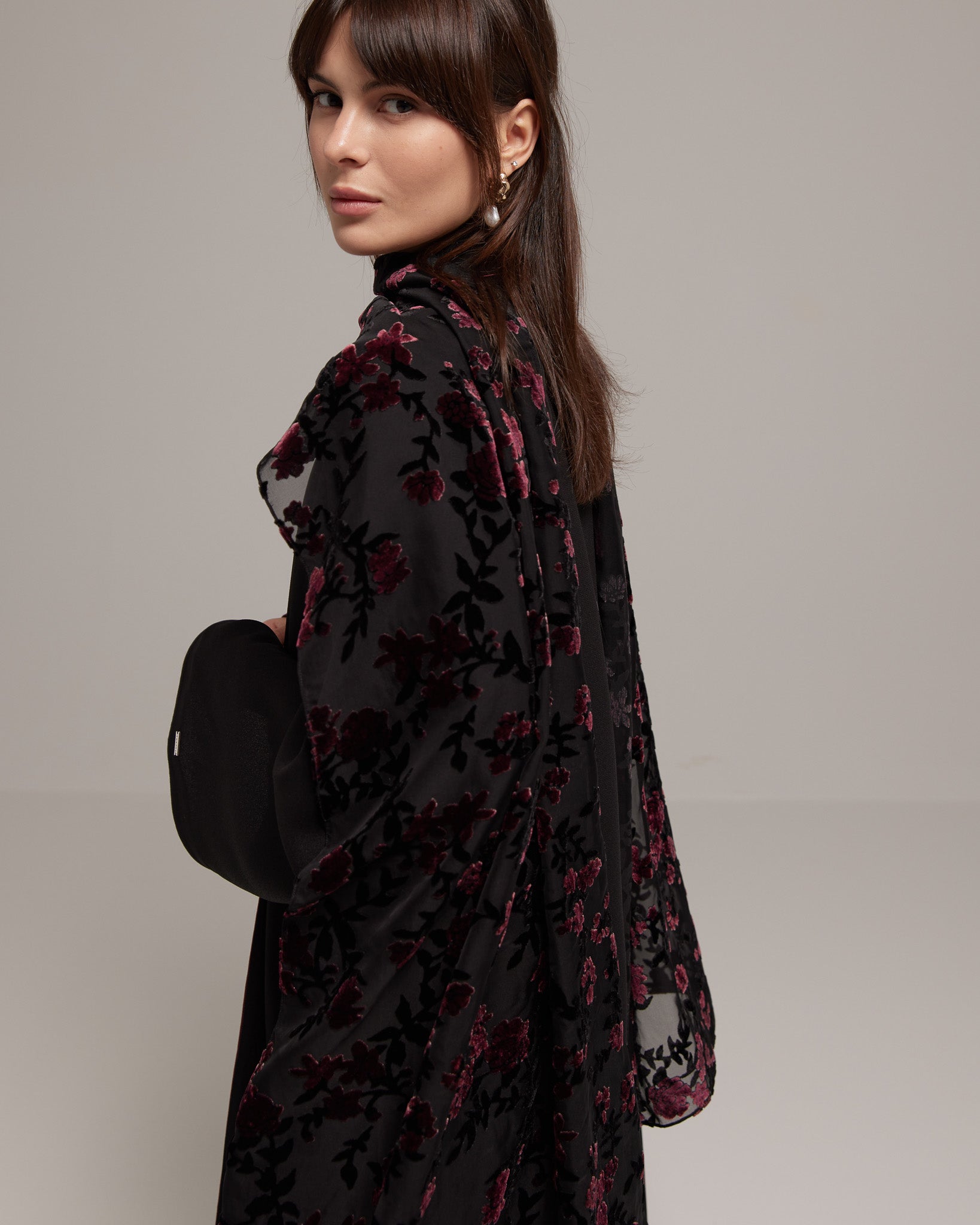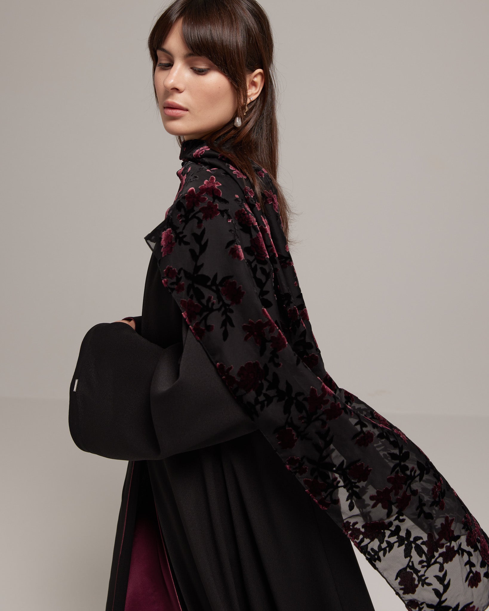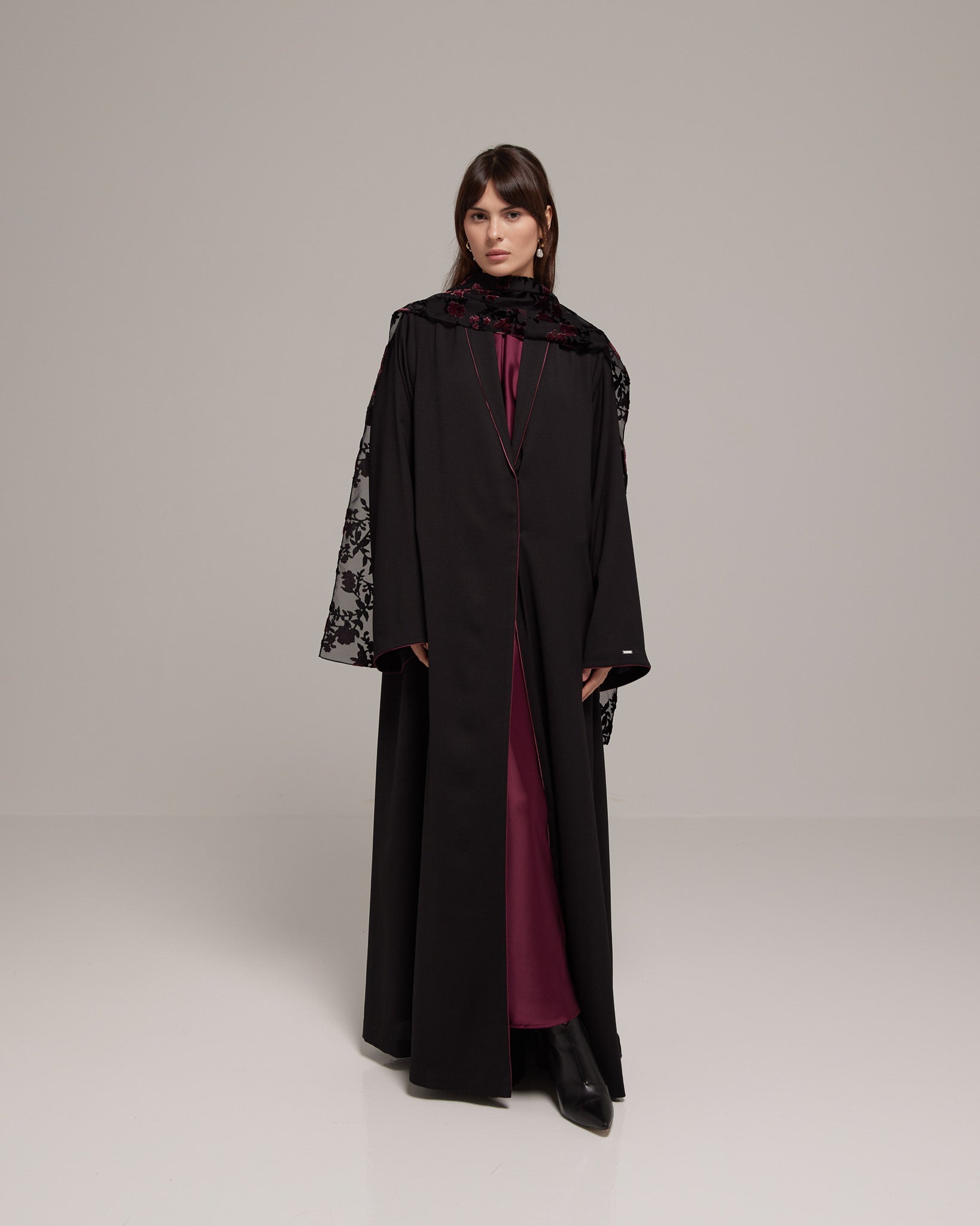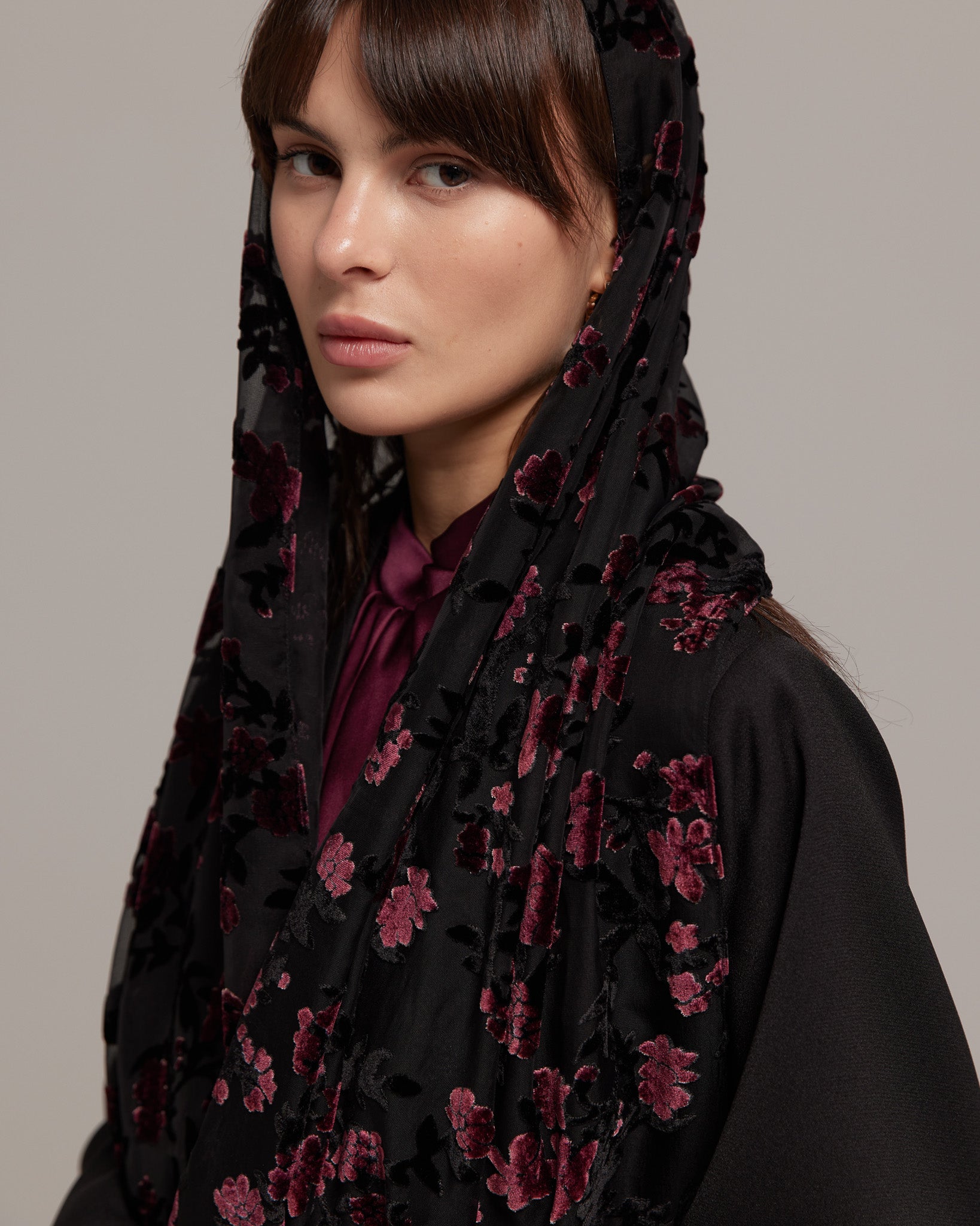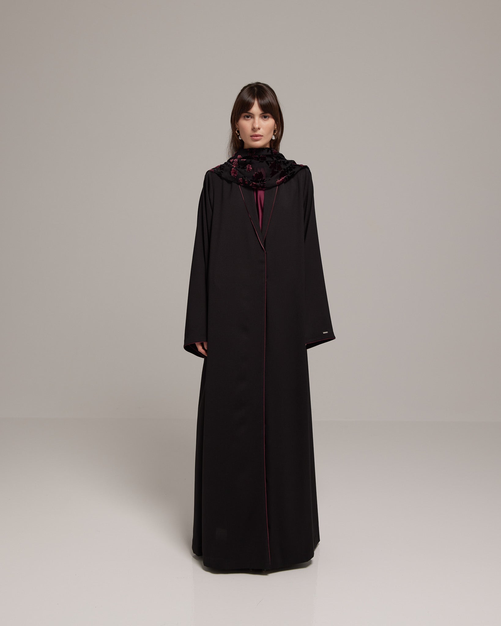 A black draped abaya accented with  maroon piping, paired with a maroon velvet floral sheila. Designed with understated elegance, it offers  presence through restraint.