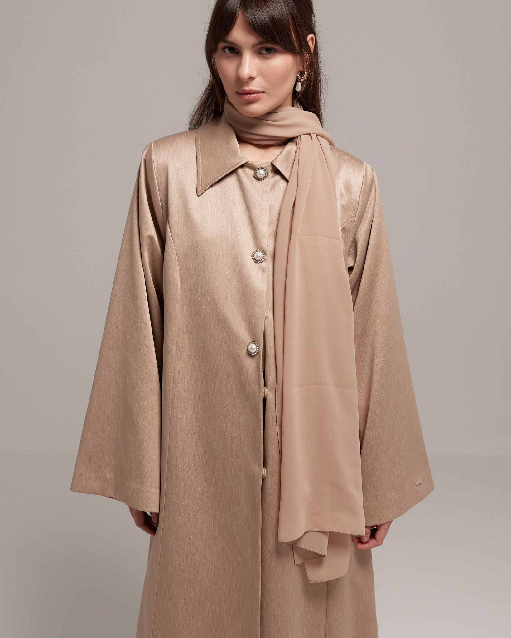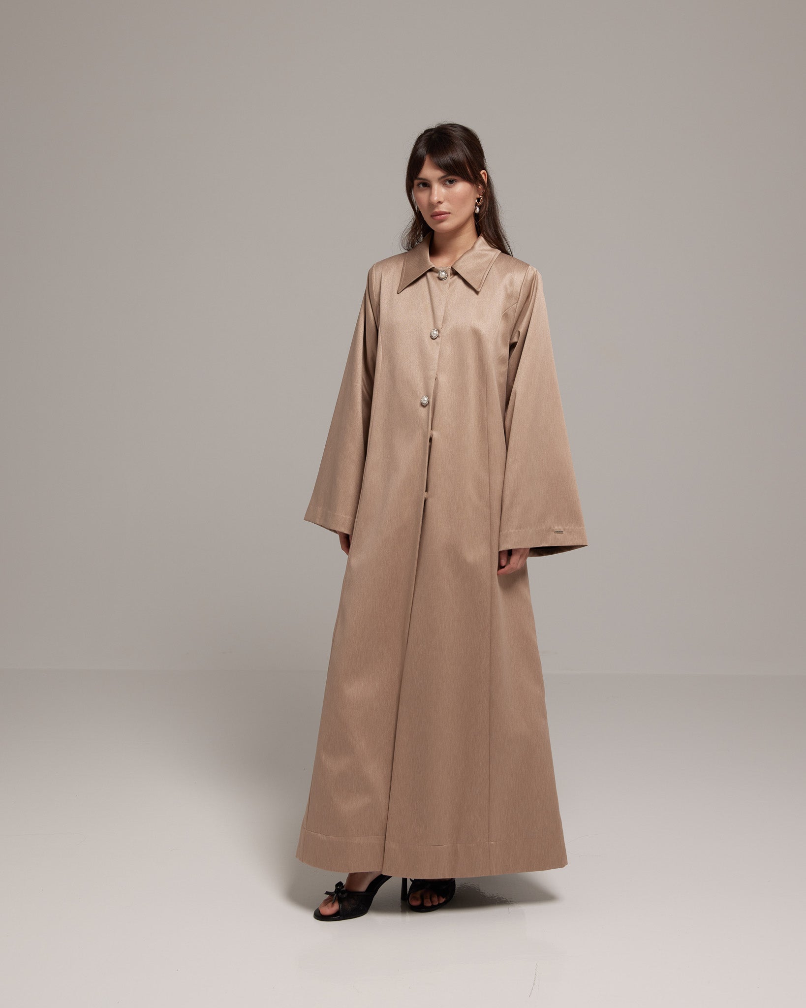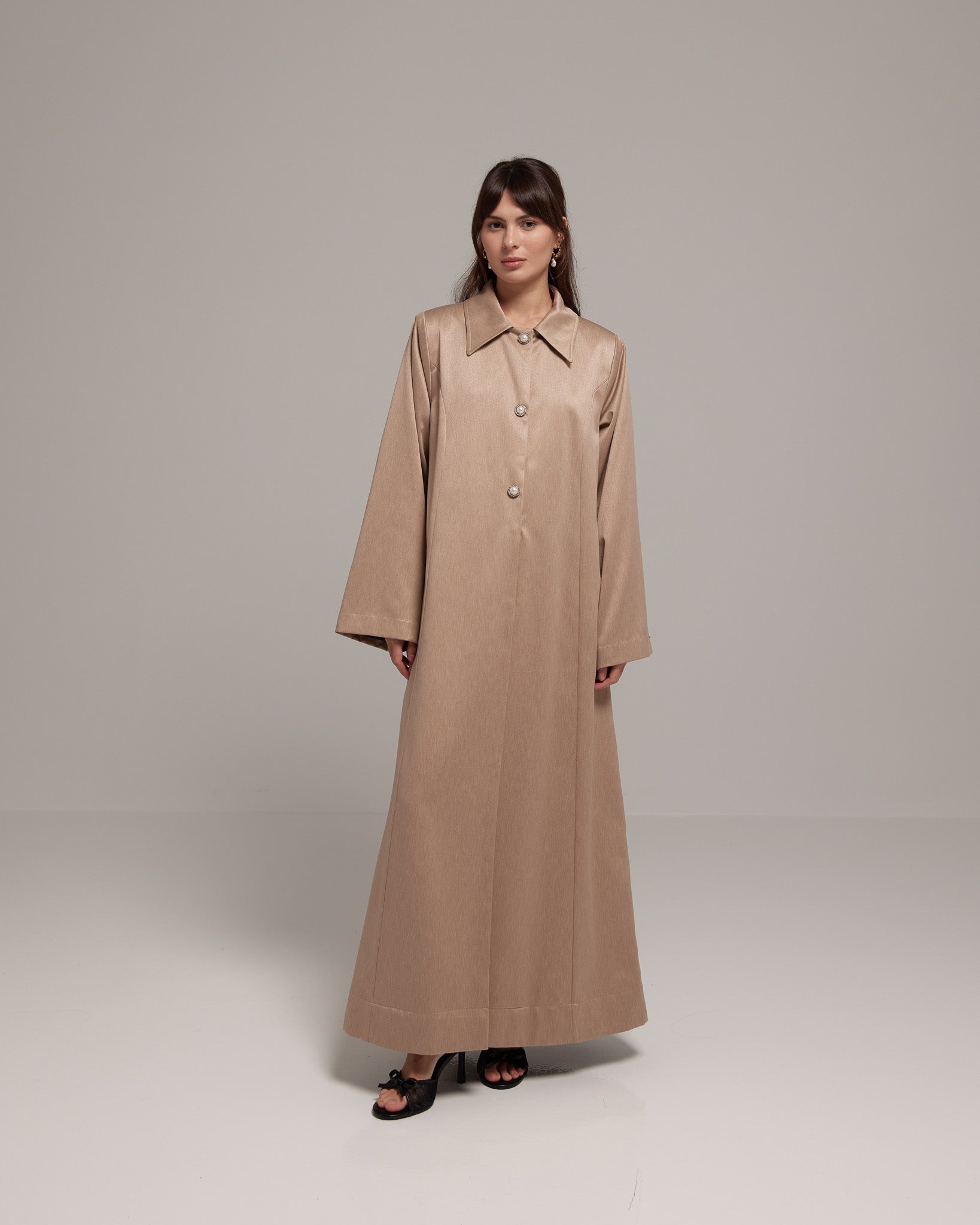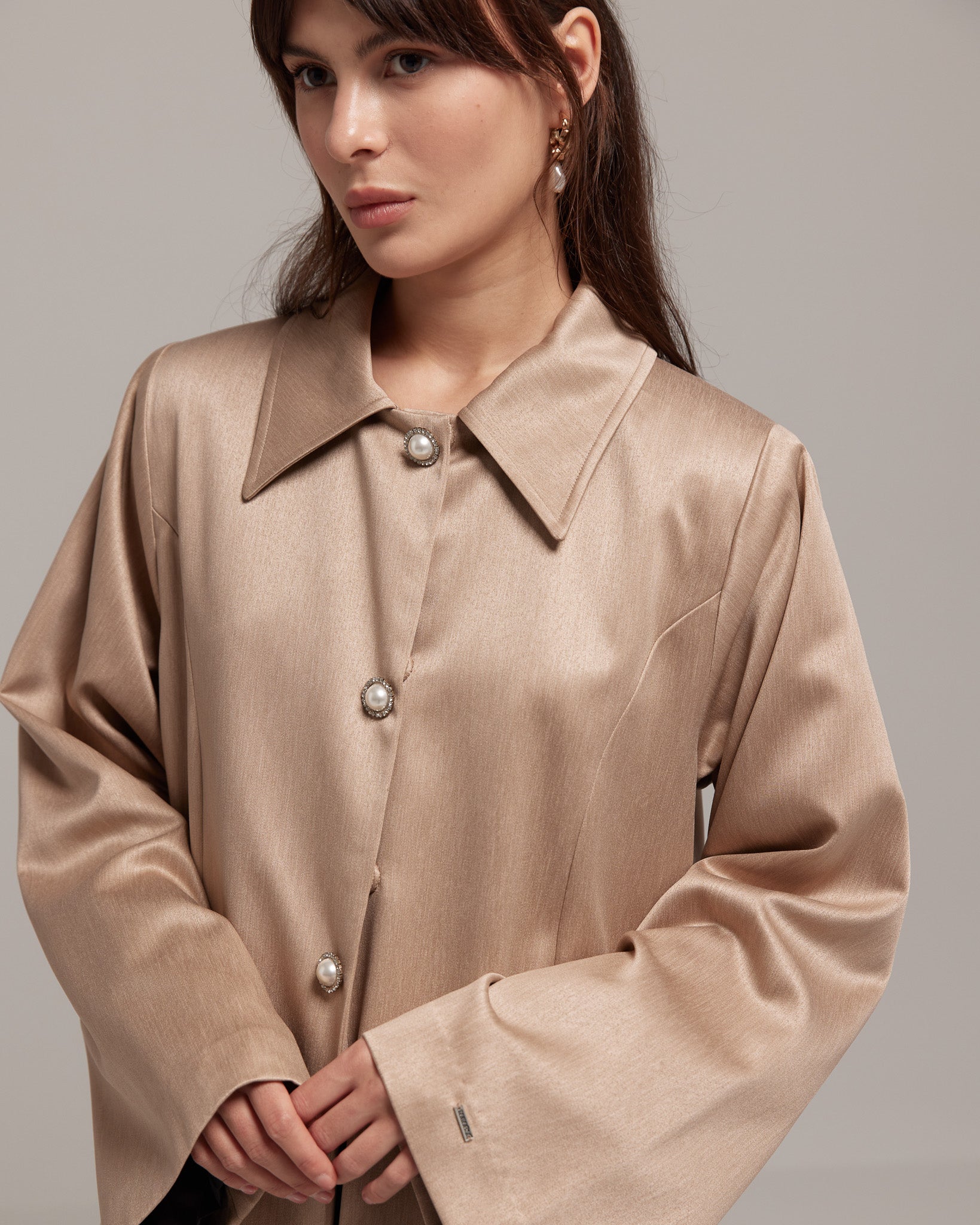 Takara Pearly, crafted from jacquard silk and adorned with pearl rhinestone buttons, its rich brown hue and A-line cut exude timeless charm.