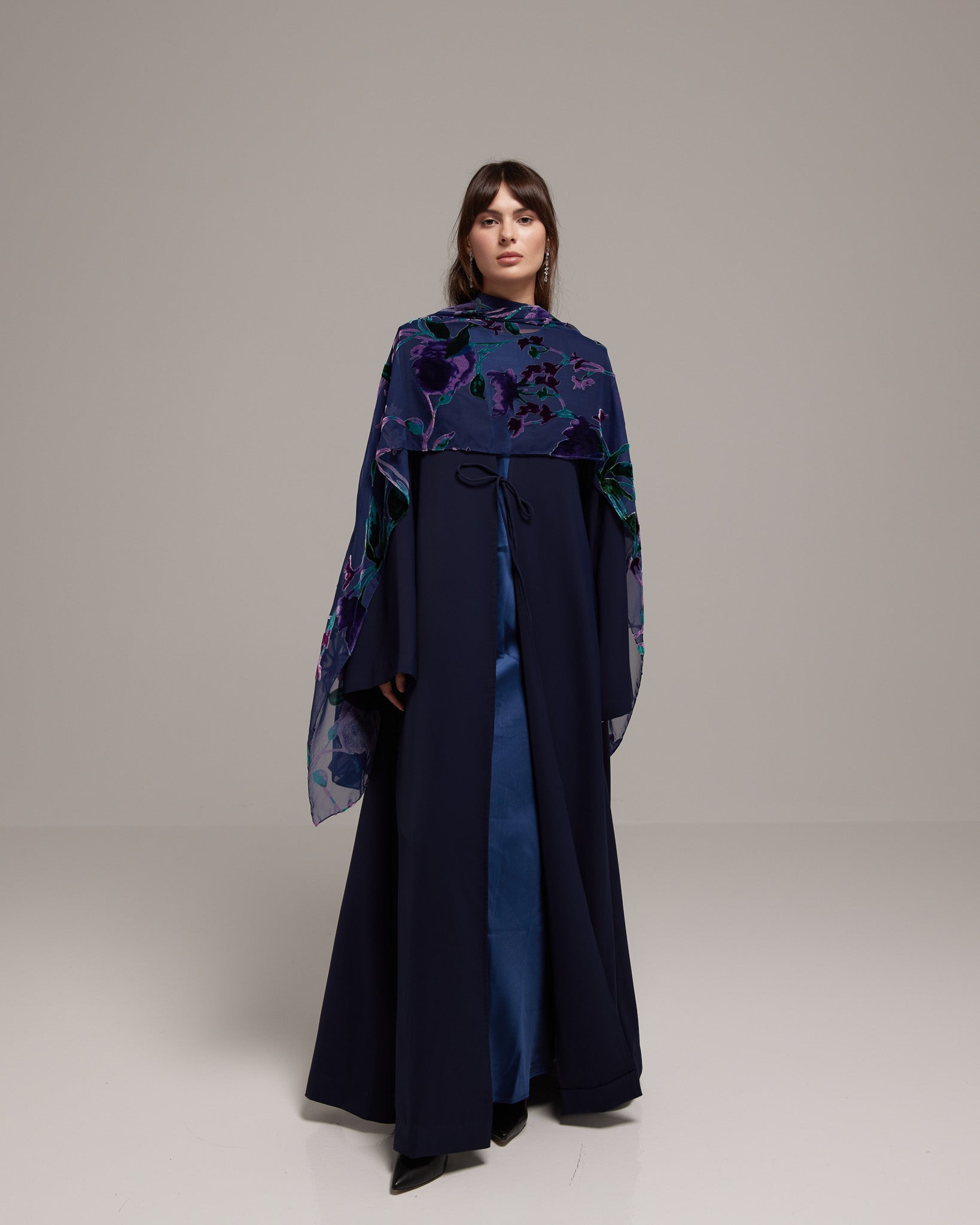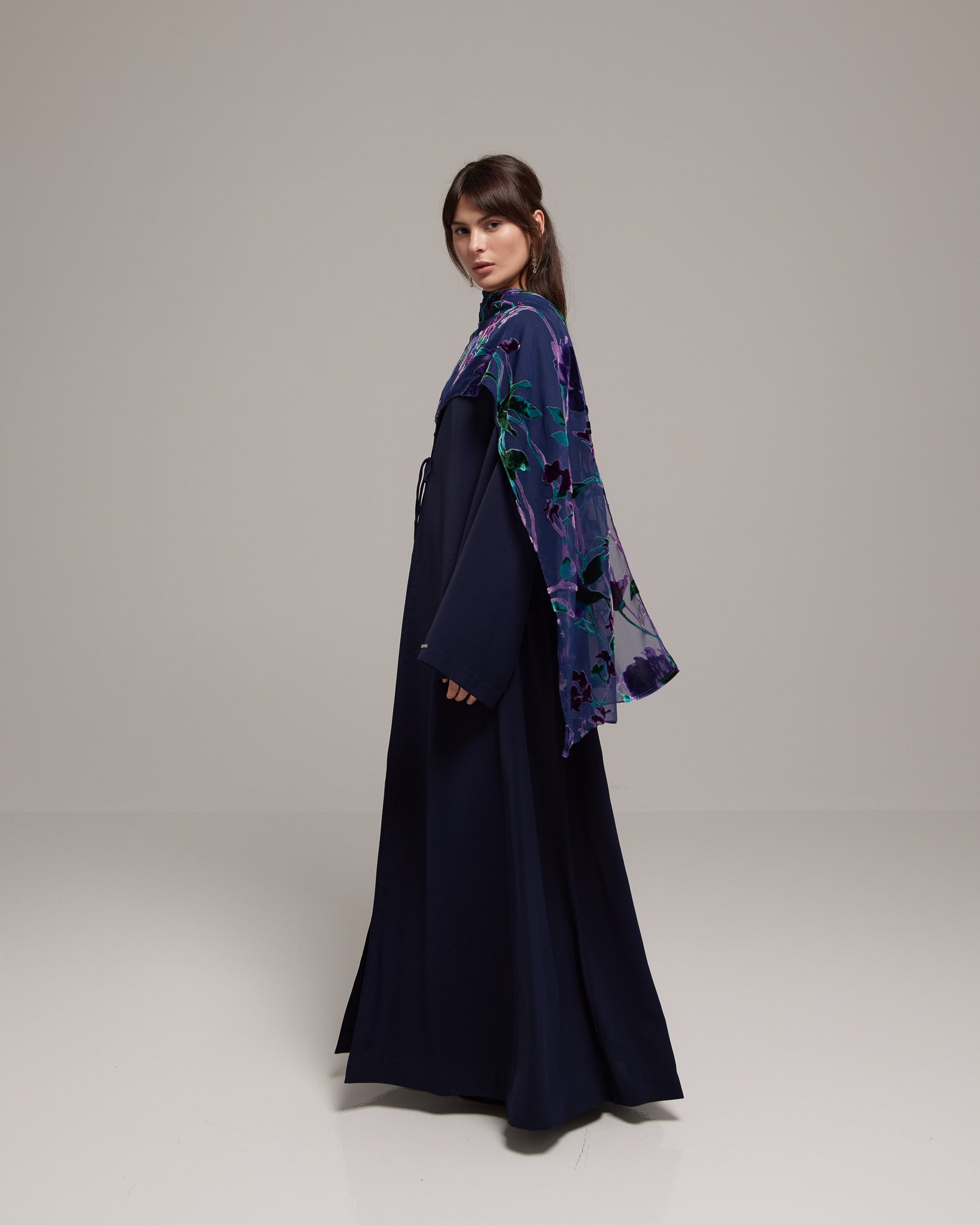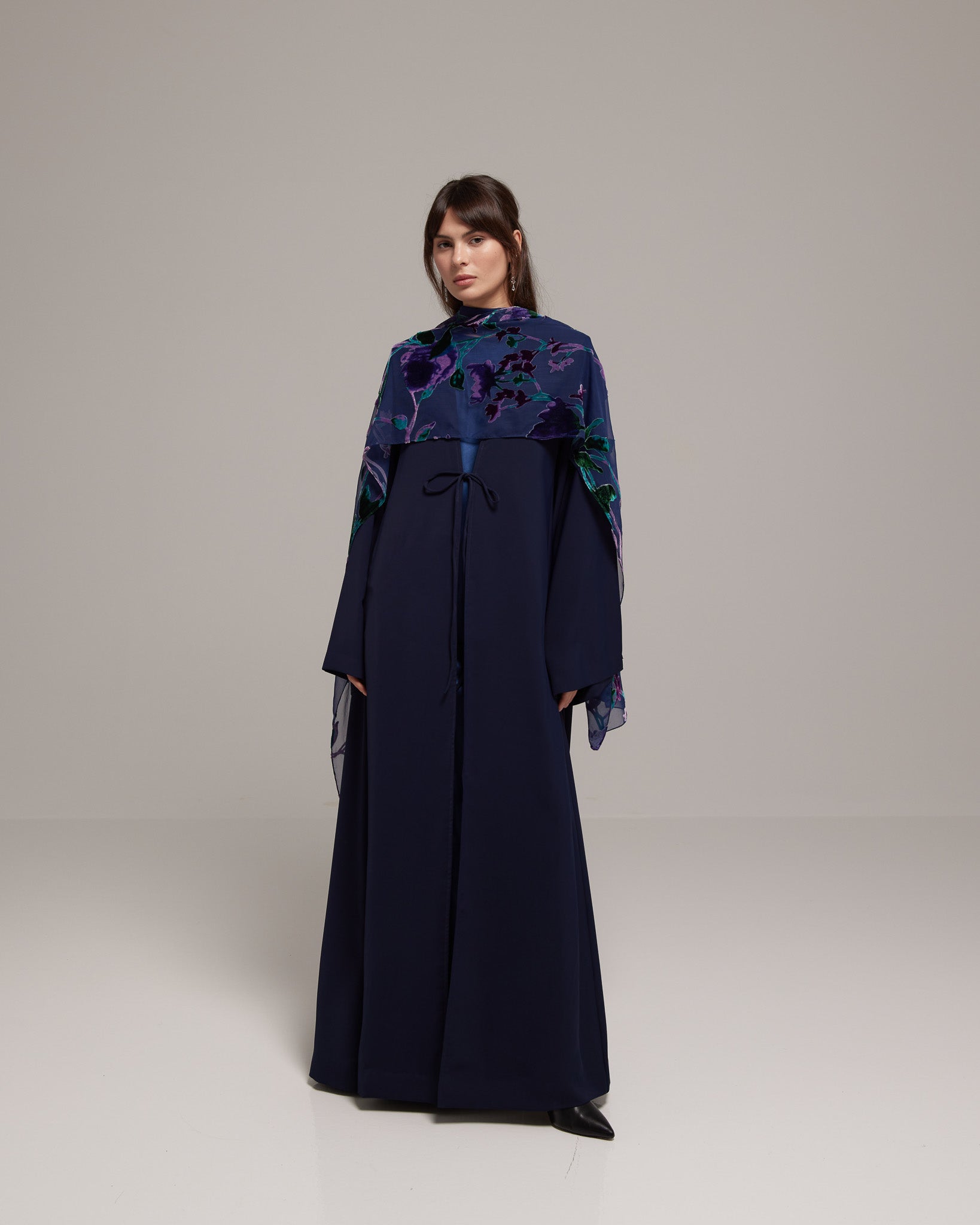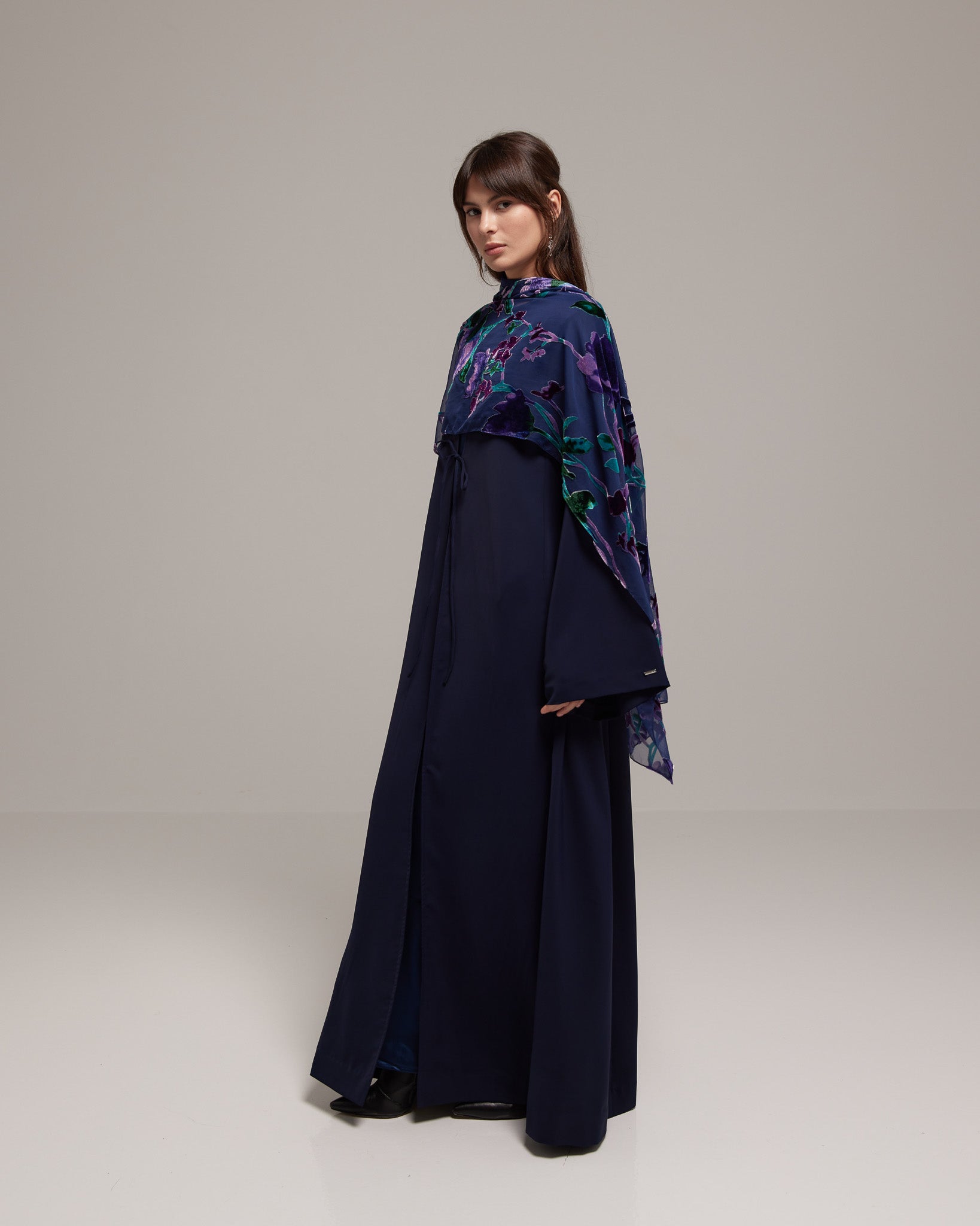 A navy blue draped abaya paired with a rich purple velvet floral sheila. The design conveys depth and quiet elegance with refined femininity.