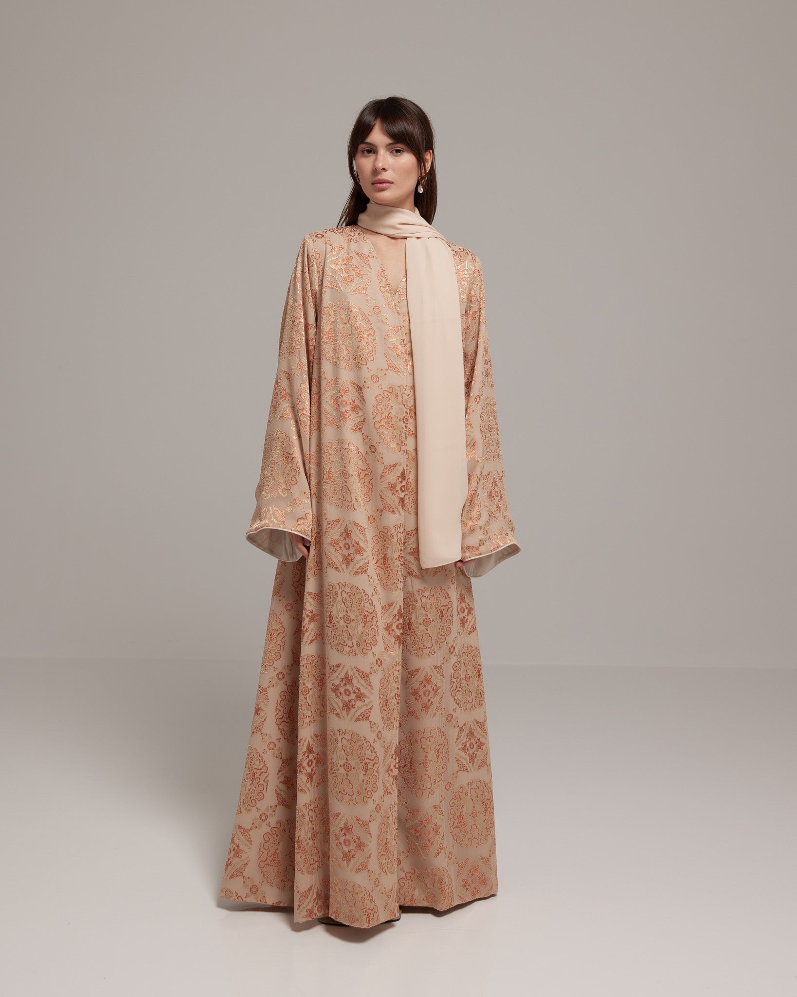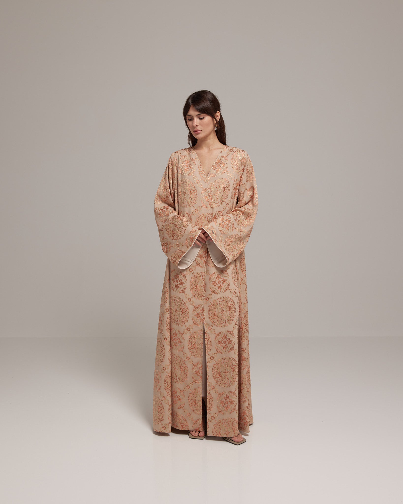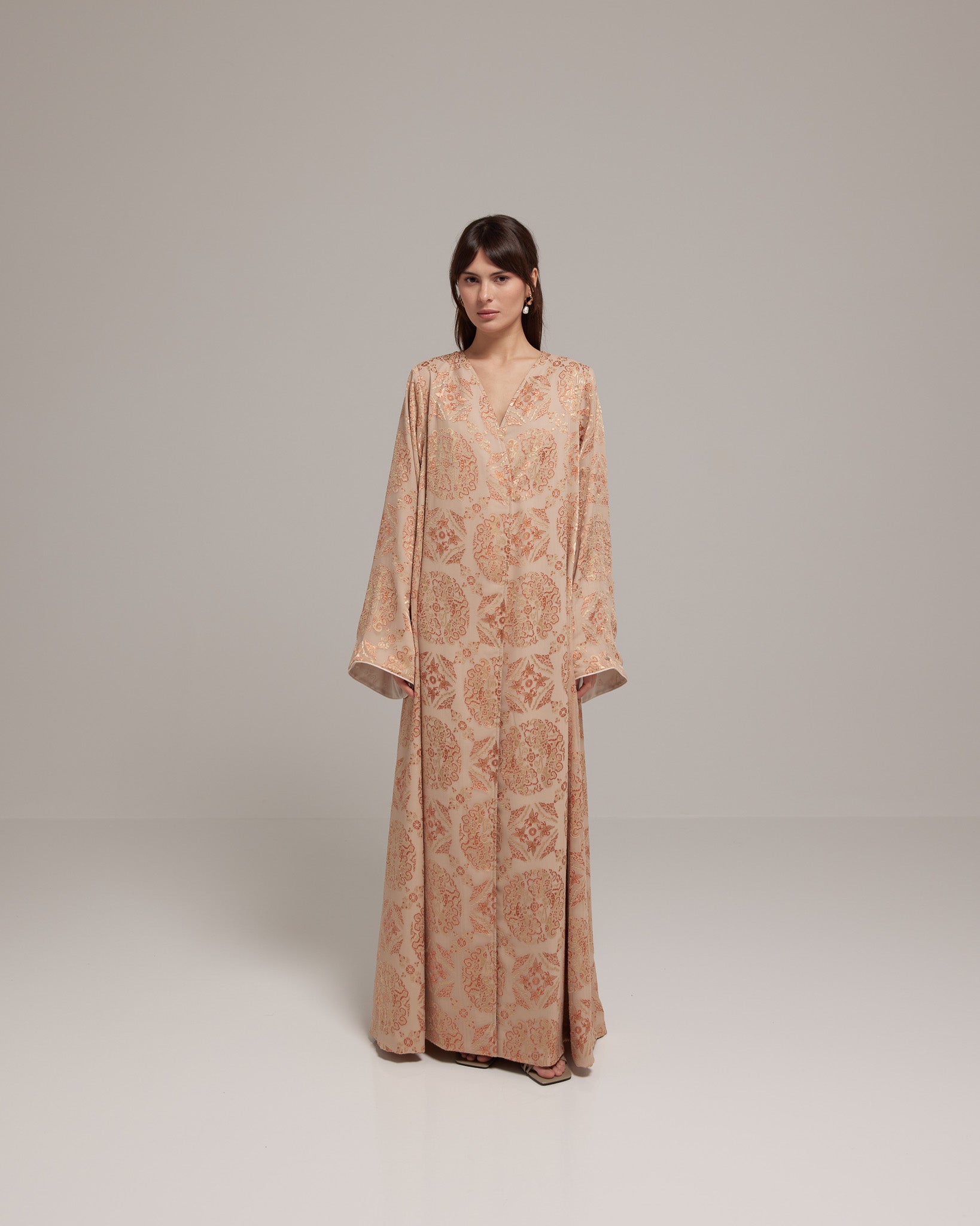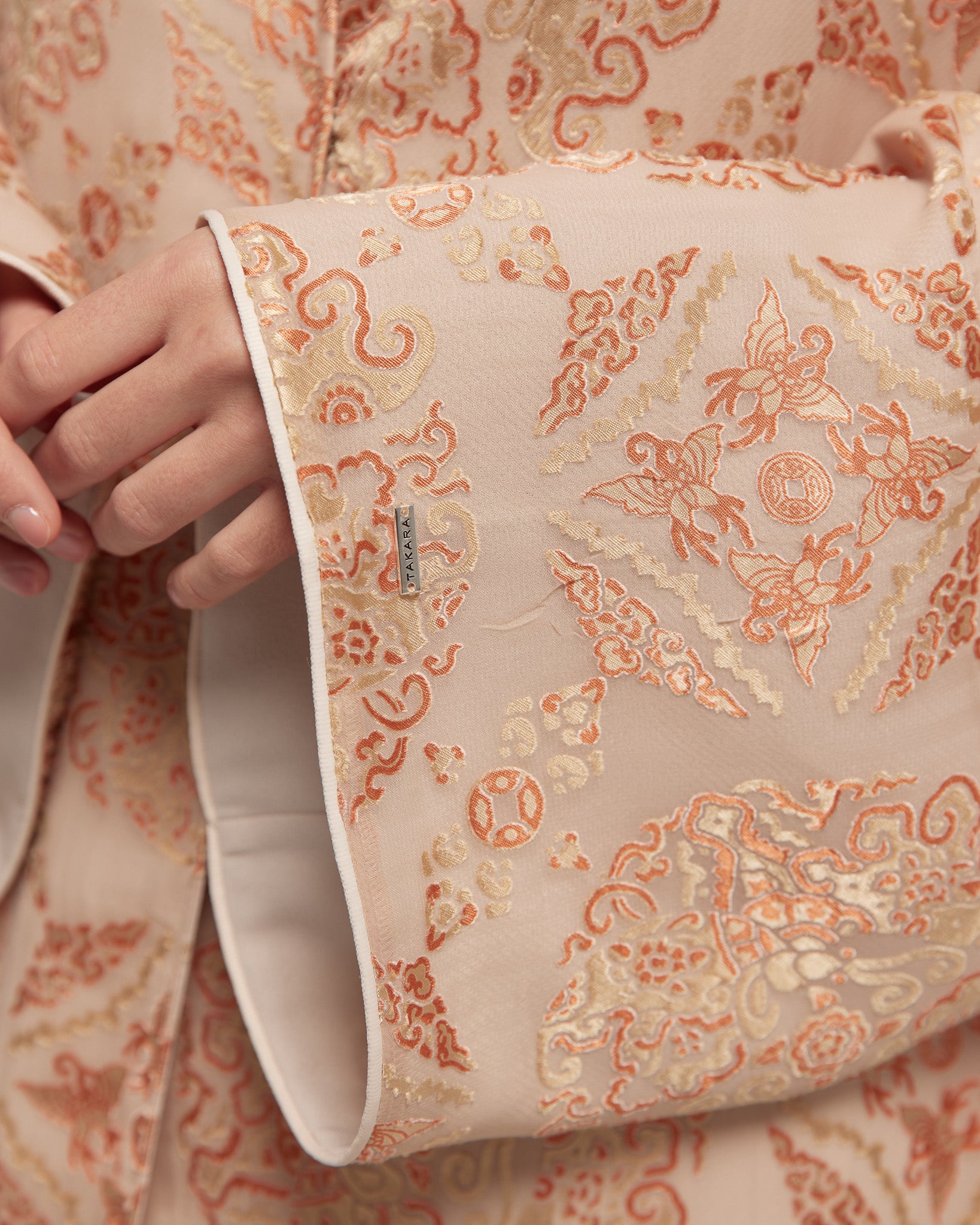 Crafted in a richly textured floral fabric with a soft, fluid drape, this piece offers refined movement and understated sophistication.