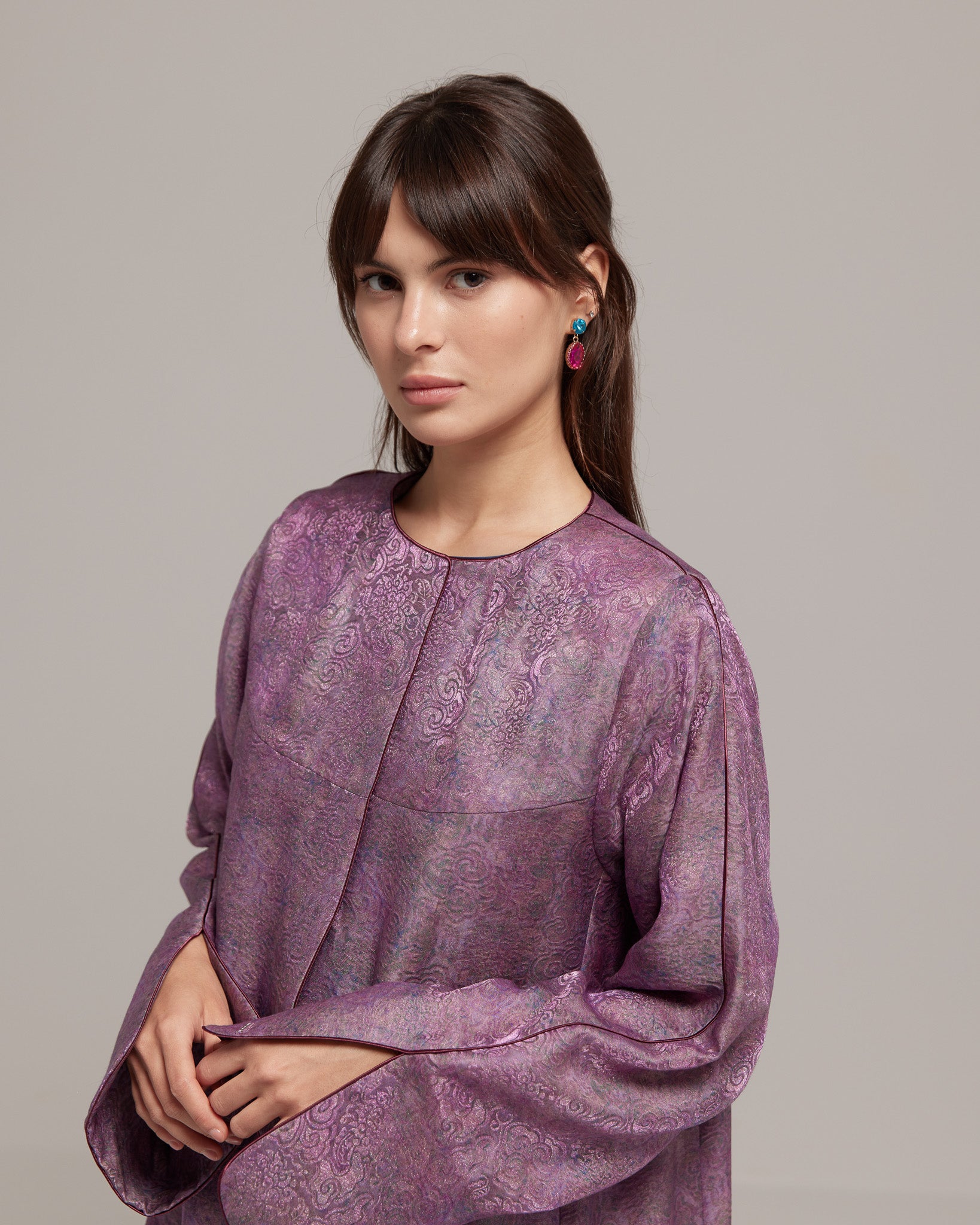 Crafted in a jacquard-woven fabric  with a breathable feel and fluid drape,  this piece moves with refined ease.  The woven texture adds subtle depth,  reflecting Takara’s elegant restraint.
